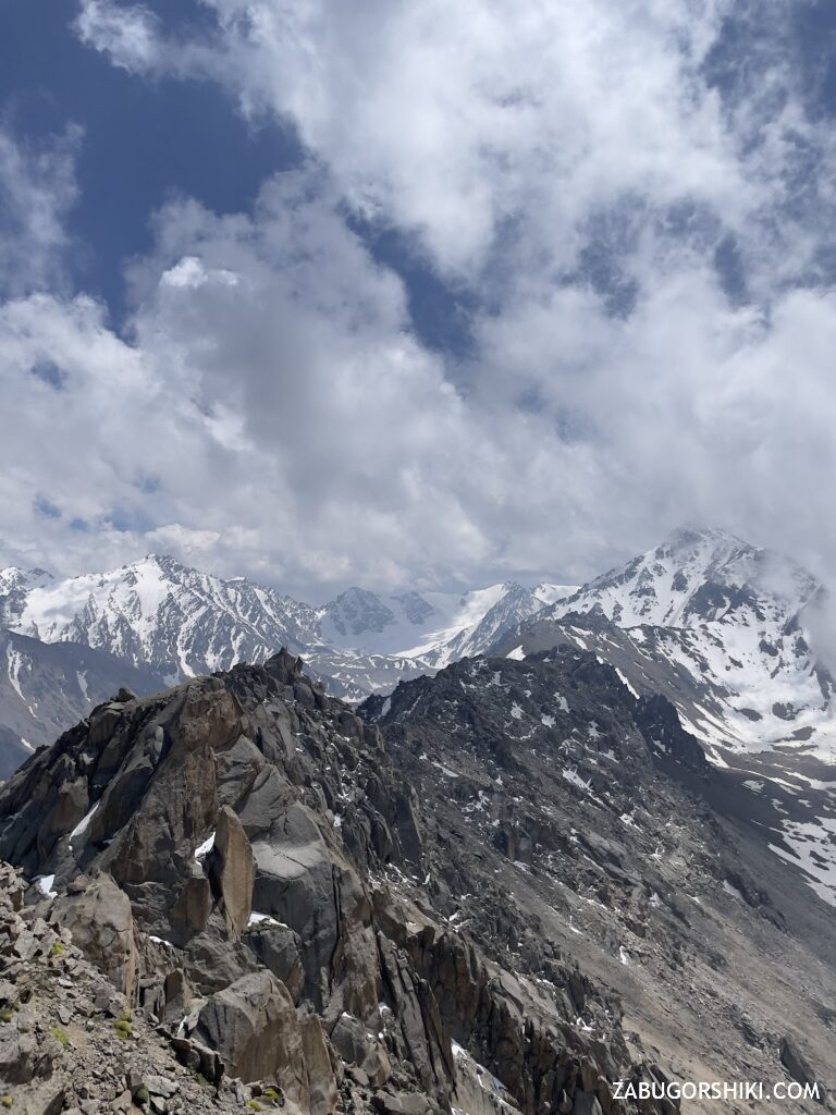 С вершины открывался потрясающий вид на соседние пики. Слева виднелся пик Октябрь (4141 м), чуть правее — пик Гигант (4180 м). Вдали правее Гиганта — пик Гагарина (4085 м), еще правее чернела полоса пика Равновесия (4077 м), далее — пик Узловой Каргалинский (4128 м). А самый правый и большой — это пик Первомайский (10 лет независимости Казахстана) высотой 3990 метров.