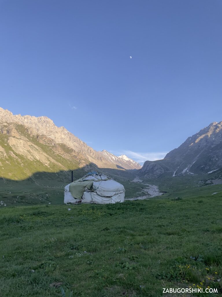 Спустился я спокойно и быстро — кулуар был в снегу, и хотя по нему было мокро идти, но приятно. Вернувшись к палатке, у меня еще оставалось время, и я решил сходить к юрте (которая, как всегда, была закрыта). Эта юрта предназначена для егеря, но его там не было.